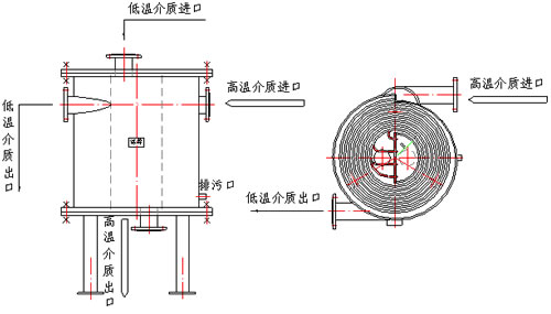 ○2可拆式Ⅱ型 可拆式Ⅱ型換熱器管內通道為閉式,介質螺旋狀運行,管外通道介質上下直通運行,主要適用于無壓力或兩個通道壓差大的場合,管內通道走壓力大、腐蝕嚴重者。這樣可節省材料且布局更趨合理性。